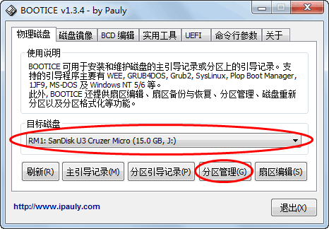 插入U盘-双击"2_引导设置.exe"即可进入BOOTICE主界面,【目标磁盘】下
