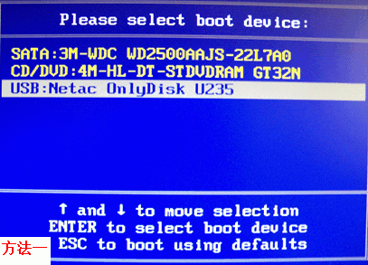 方法一:开机列表选择法。即开机按“F12”键(有的电脑按“ESC”键或“F10”键....),屏幕会显示一个驱动器列表,如图。