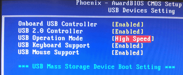 (2)、在上述情况下,如果U盘运行缓慢,有可能是BIOS设置错误,请将USB Operation Mode这项设置成HighSpeed(高速模式),如图: