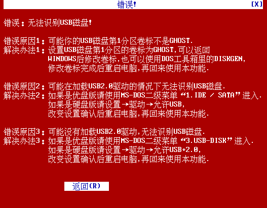 小提示:如果选择“U盘”或“移动硬盘”GHOST出错或无法运行(无法找到USB磁盘,如下图所示),有可能是usb驱动模式不正确,