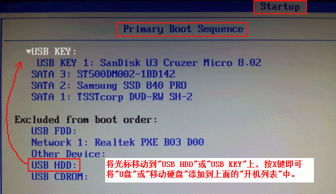 然后,将下方的“备选列表”中的USB选项添加到上方的“开机列表”中,如下图B。
