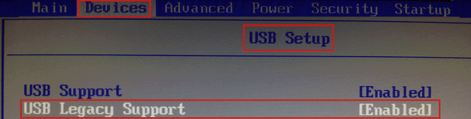 首先,选择 Devices - USB setup - USB Legacy Support 设置为 Enabled,如下图A。