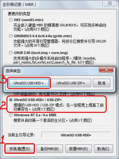 重新插入U盘-重新运行BOOTICE-【主引导记录】-ultraiso USB-HDD+……-安装/配置-UltraISO USB-HDD+-提示成功-关闭退出BOOTICE,拔掉U盘。
