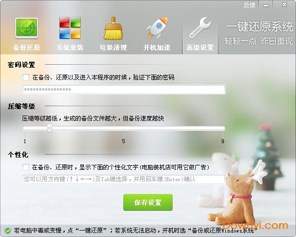 一键还原系统是全程傻瓜式操作的系统备份还原工具,其备份速度比ghost还快,压缩率更出色,在相同的压缩率下,它的备份速度是ghost的五倍。体积小巧功能强悍!支持所有主流windows系统以及包括efi/gpt硬盘在内的各种新旧硬件;它还自带简便的垃圾清理和开机加速功能!