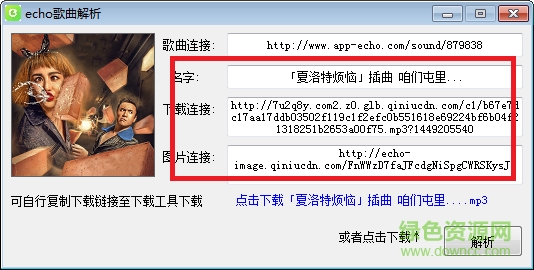 echo歌曲解析助手是一款体积小巧、操作简单的音乐链接地址解析软件,支持歌曲名字、下载链接和图片链接的解析,只需要载入歌曲链接到软件中,即可进行解析操作,方便快捷,并且还支持歌曲文件的下载功能,点击下载地址即可跳转至下载界面进行下载。