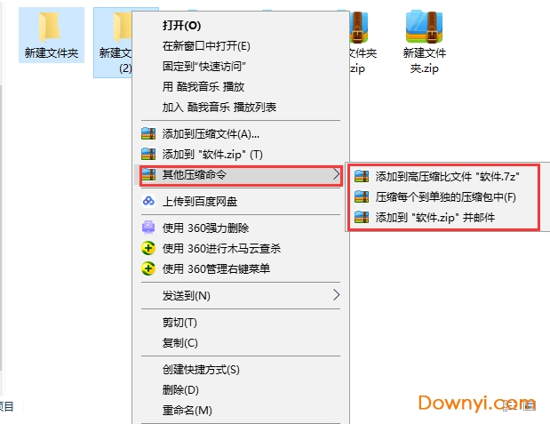 1、首先我们在本站下载安装好360压缩软件后,我们就可以在电脑上使用了,我们找到需要压缩的一个或者多个文件夹,选中后我们鼠标右键点击选中的文件,就会弹出菜单栏,如下图所示,在菜单栏中我们就可以看到有“添加到压缩文件”、“添加到xx.zip”以及其他压缩命令三个选项,一般我们常用的是前两个。