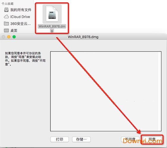 1、打开【WinRAR_8978.dmg】文件,弹出安装窗口,点击右下角的【同意】