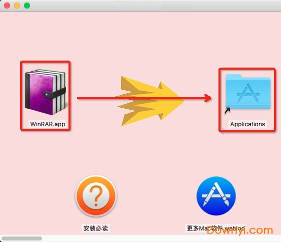 2、将【WinRAR.app】拖入到【Applications】文件夹中