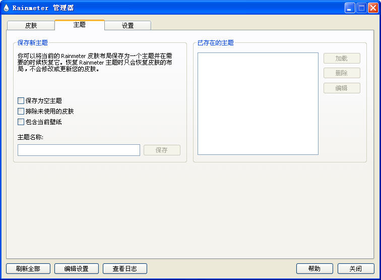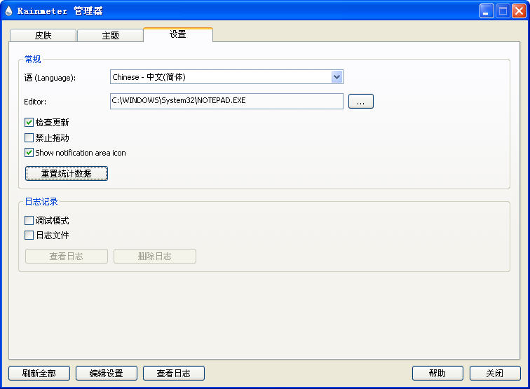 现在Rainmeter主打的皮肤,典雅的设计搭配很强大的主窗口,确实很容易上手。主窗口亮蓝色的部分点击可以打开对应的组件,暗蓝的部分用来切换组件的大小。中央的设置按钮可以方便地设置几个组件所需的变量。另外新加入的主题管理器RainThemes里面存了三套界面设置方案,不妨尝试一下。
