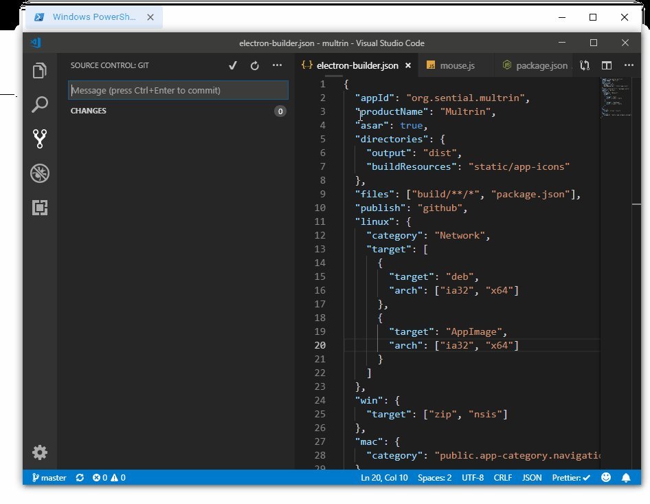multrin 基于 electron、react、typescript 等开源项目开发而来,有着跨平台的可能性,可惜目前作者仅发布了 windows 版,macos 目前没有准确的计划。不过作者也已经在慢慢地完善该软件了,比如最近也加入了流行的“暗色主题”的来适配新版 win10 的黑暗界面 (dark mode)。如下图,配合黑色界面的 visual studio code 看起来特别的帅: