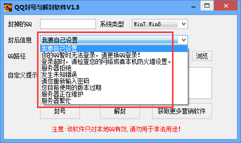 qq封号与解封软件是一款封qq号的实用软件,软件的作用是封qq与解封qq,虽然只是作用于本地,但也能有效的限制孩子不能上QQ和整蛊朋友,喜欢的朋友欢迎下载使用。