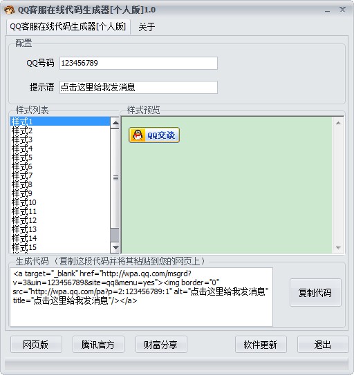 QQ代码生成器主要功能可帮助用户快速的生成QQ客服代码,方便在网页中来进行调用,软件内置了十几种样式可供选择,支持自定义QQ及提示语。