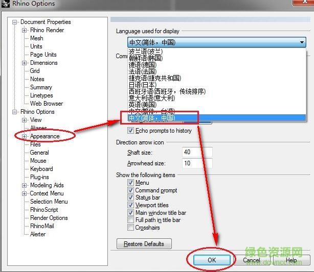 4.在左侧栏中找到“Apperance”,在“Language used for display”下拉中选择语言(中文简体),然后点击“OK”