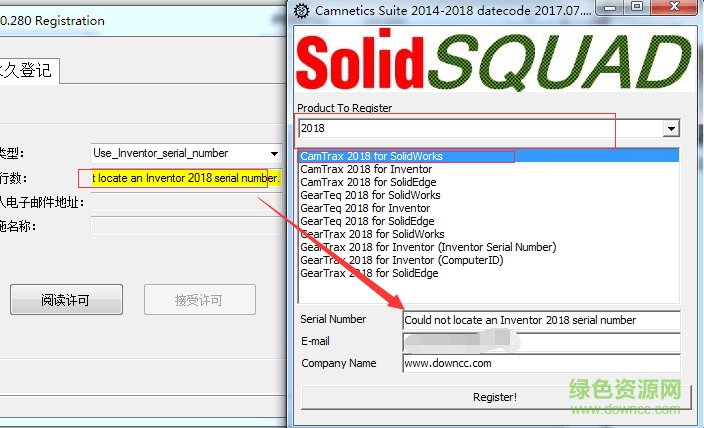 6.选择好2018,然后根据自己的需要选择好相应版本,然后把串行数复制在Serial Number之中,填好邮件和自己的name,点击Register,注册成功,可以开始使用了。