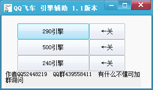 QQ飞车引擎辅助是一款功能出色,使用稳定的QQ飞车辅助工具2017最新版,它主要提供290引擎、500引擎、240引擎的开关功能,而且使用简单,不非法,欢迎各位飞车小伙伴下载使用。