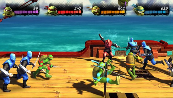 扮演所有4名龟战士:达芬奇、拉斐尔、多纳泰罗和米开朗基罗都是可以操控的,每个人都具备各自独特的移动,武器和战斗技能,例如米开朗基罗的双节棍脸击技和拉斐尔的叉掷技。