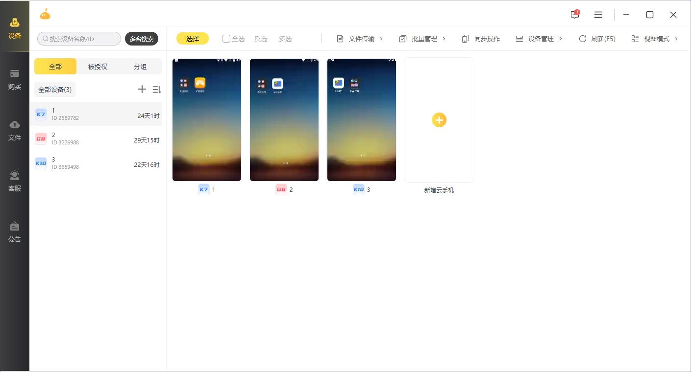 可实现一台手机或平板同时控制多台云手机的功能。所有设备同屏预览,随时查看,可轻松同步操作,一键重启、一键恢复出厂设置、批量安装和卸载应用、虚拟定位等,体验更便捷,操作更省时。