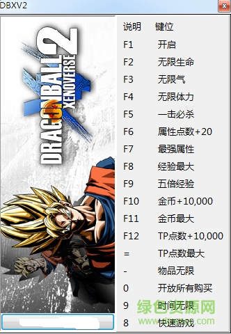 龙珠超宇宙2十六项修改器是一款提供十六种实用功能的游戏作弊工具,包括无限生命、无限体力、一击必杀等,还能为自己修改人数属性和加钱加经验,但是金币,TP点需在菜单中进行修改,感兴趣就来绿色资源网下载吧!