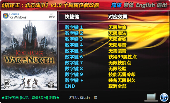指环王北方战争十项修改器是由玩家风灵月影专为游戏《指环王:北方战争》制作的作弊工具。通过修改器,可以把金钱、生命、魔法、经验、技能点等都修改为无限,帮助玩家轻松通关游戏。赶快下载体验吧!