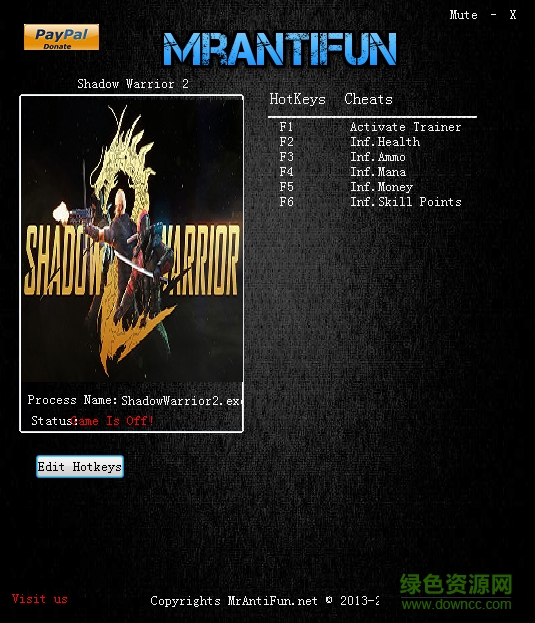 影子武士2修改器是针对同名pc游戏玩家提供的一款免费辅助工具,通过该辅助玩家可以一键修改游戏中的无限血、无限子弹、无限金钱等五项属性,合理的修改属性可以帮助玩家更轻松的体验游戏,需要的朋友欢迎来绿色资源网下载!