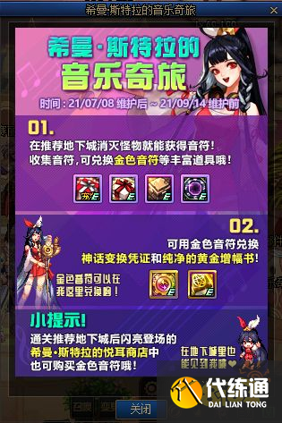 这个活动就是【希曼·斯特拉的音乐奇旅】,玩法相当简单,只需要在推荐地下城内收集[音符],然后在商店兑换金色音符与其他奖励道具。