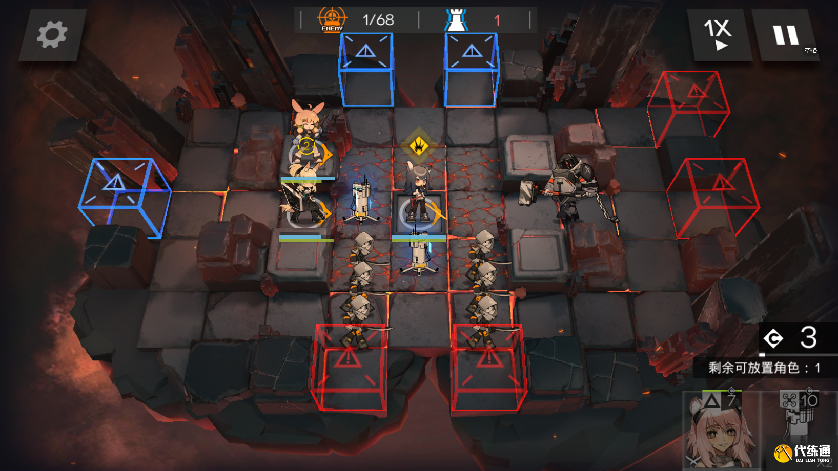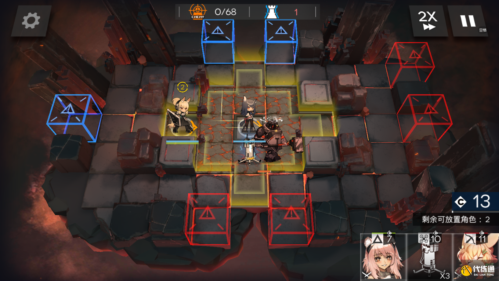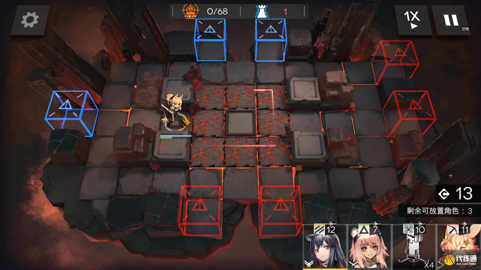进入关卡后观察地形可以看到,在地图的中央九宫格区域中,除了最中间区域之外都被地火所覆盖。敌人的行动路线则是围绕着中间区域进行转圈,而且第一个登场的敌人就是粉碎攻坚手这样的高防敌人,凭借我方干员根本无法完成击杀,也就是说必须要让敌人尽可能吃到来自地火的真实伤害,因此具有控制能力的干员德克萨斯就需要放在九宫格的正中央。