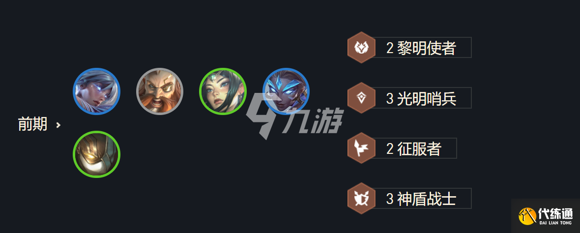 早期的过度阵容为:2黎明使者,3光明哨兵,2征服者,3神盾战士。