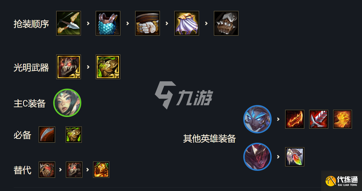 刀妹:反甲、龙牙、狂徒,如果没有刺客或暴击可以选择反甲换泰坦、日炎,光明装备适用所有肉装。豹女:羊刀、饮血,泰坦或正义。多余的输出装可以给锐雯或武器,多余的肉装或是救赎给到瞎子。纹章转职:神盾、铁甲、黎明、征服、哨兵。