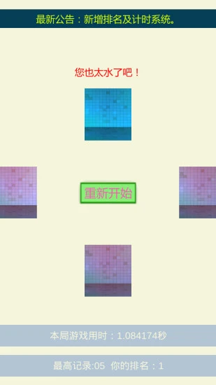 这是一款适合于儿童的记忆类小游戏,可以训练儿童的注意力。关卡等级越高,所需要记忆的方块越多,等级每次增加一级,跳动方块数目增加一个,操作非常简单。如果您的孩子,需要一款小游戏,这款小游戏值得下载尝试,完全免费的哦,而且不会有沉迷游戏的风险。