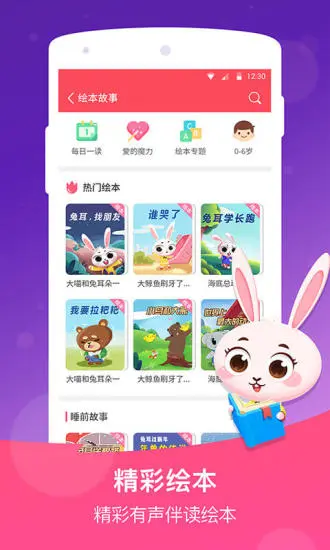 • 有声绘本——原创兔耳绘本,深受孩子的喜爱,增加护眼模式一起守护孩子的视力;