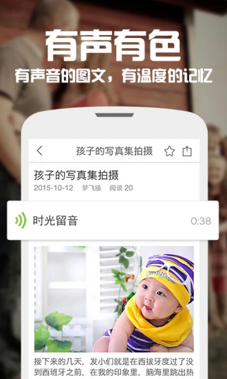 【有声有色】图文排版,随心所欲;记录最真实声音,让亲子回忆有声有色;多彩背景墙,让亲子相册更个性。