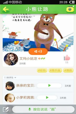 童说童画是国内首款儿童真人语音绘本绘画故事应用,让孩子的声音得到聆听与跟随。