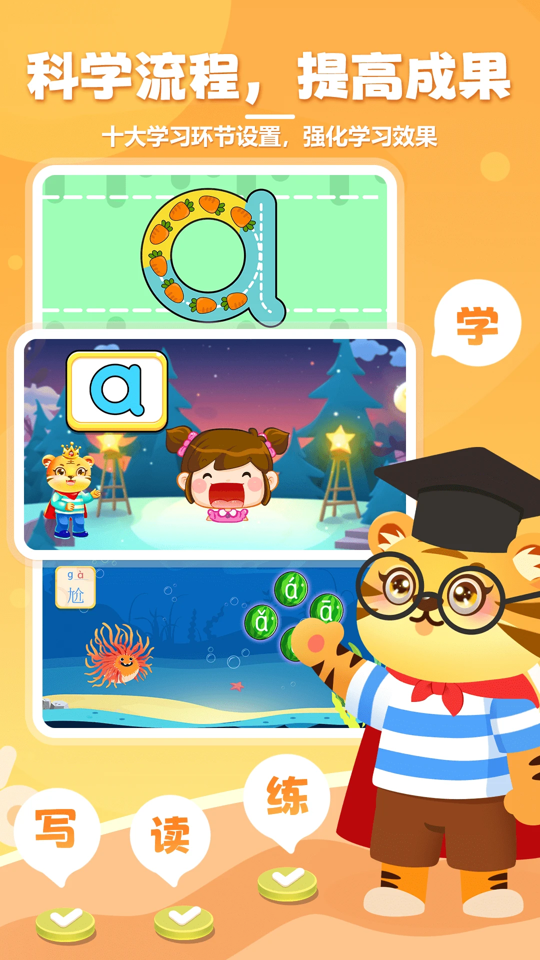 幼小衔接拼音启蒙课程,轻松学会汉语拼音和拼音拼读,包括声母、韵母、整体认读音节、声调,练习,书写、拼读全覆盖!宝宝自己在家就能学会拼音。
