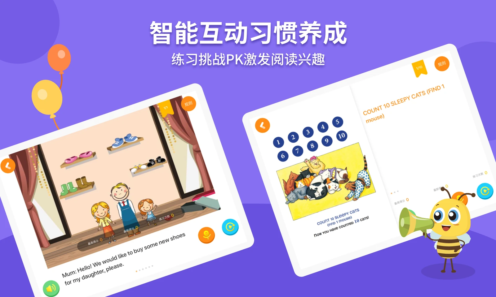 3. 激发兴趣培养习惯:记录、统计、生成磨耳朵/阅读存折,可录入其他设备数据;正向激励功能,花蜜、金币奖励;激发阅读兴趣,培养受益终生的阅读习惯