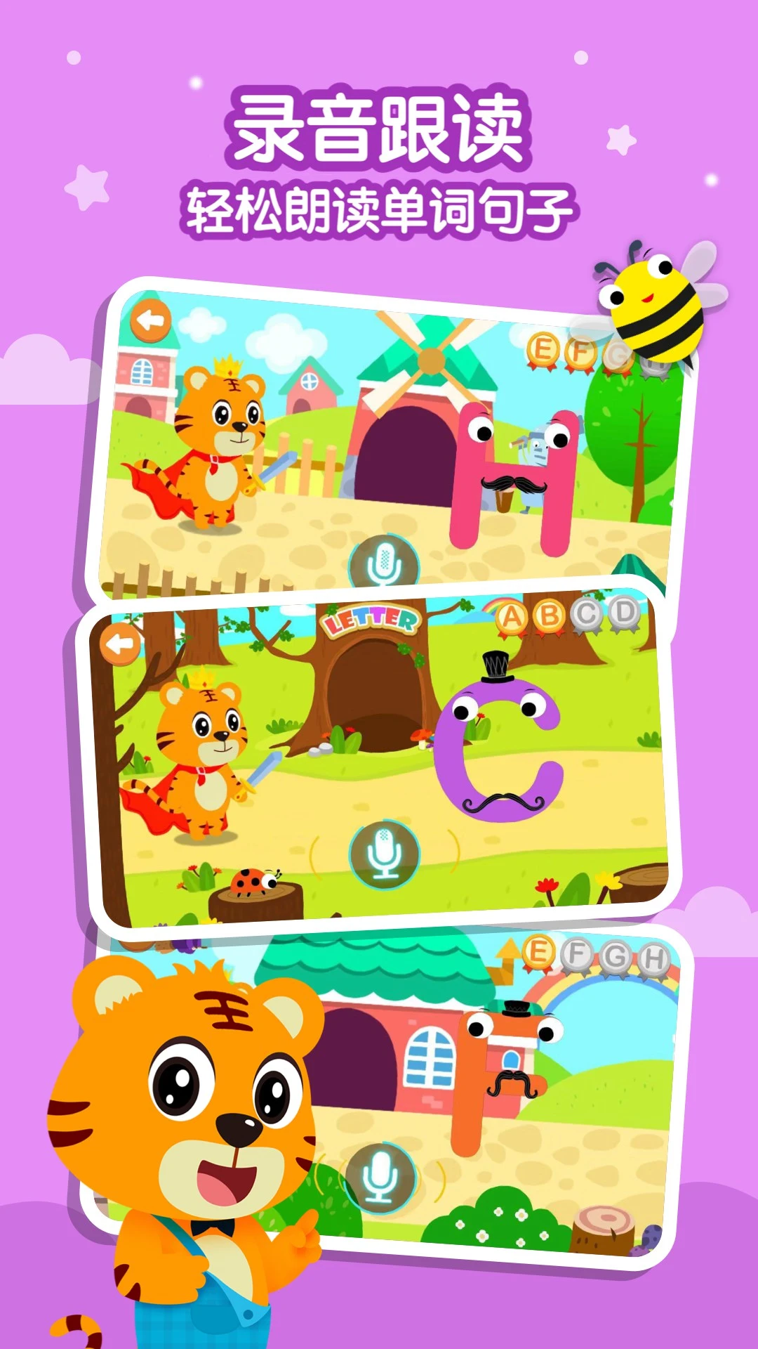 26个字母单元、200+英文单词、200+互动跟读、44首英文儿歌,分阶段对字母和单词进行专项联系。”认、说、写、练“四步轻松识字母。