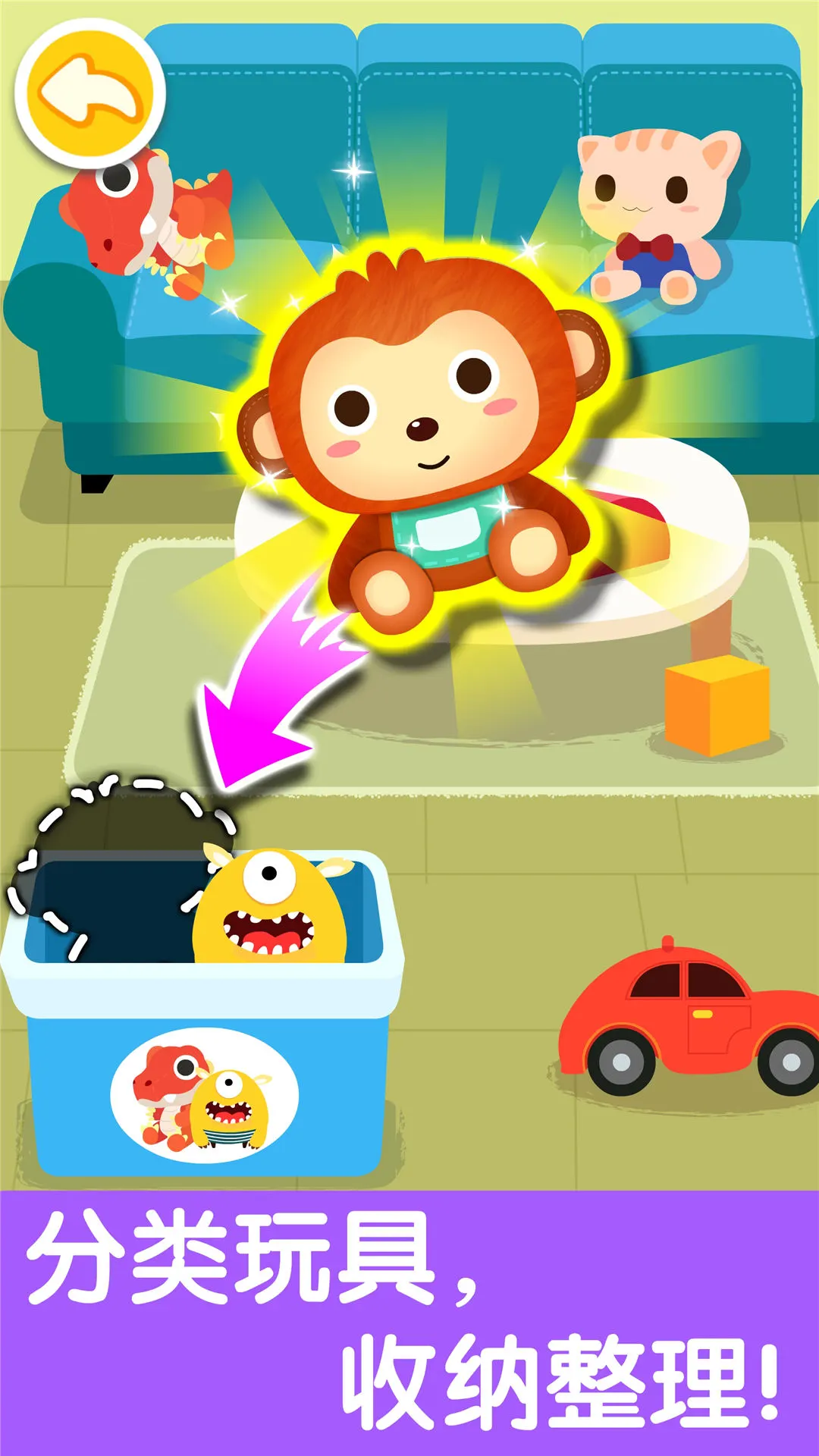 客厅里到处都是玩具!宝宝捡起积木和玩偶,分类后,把它们放进相应的收纳篮里。