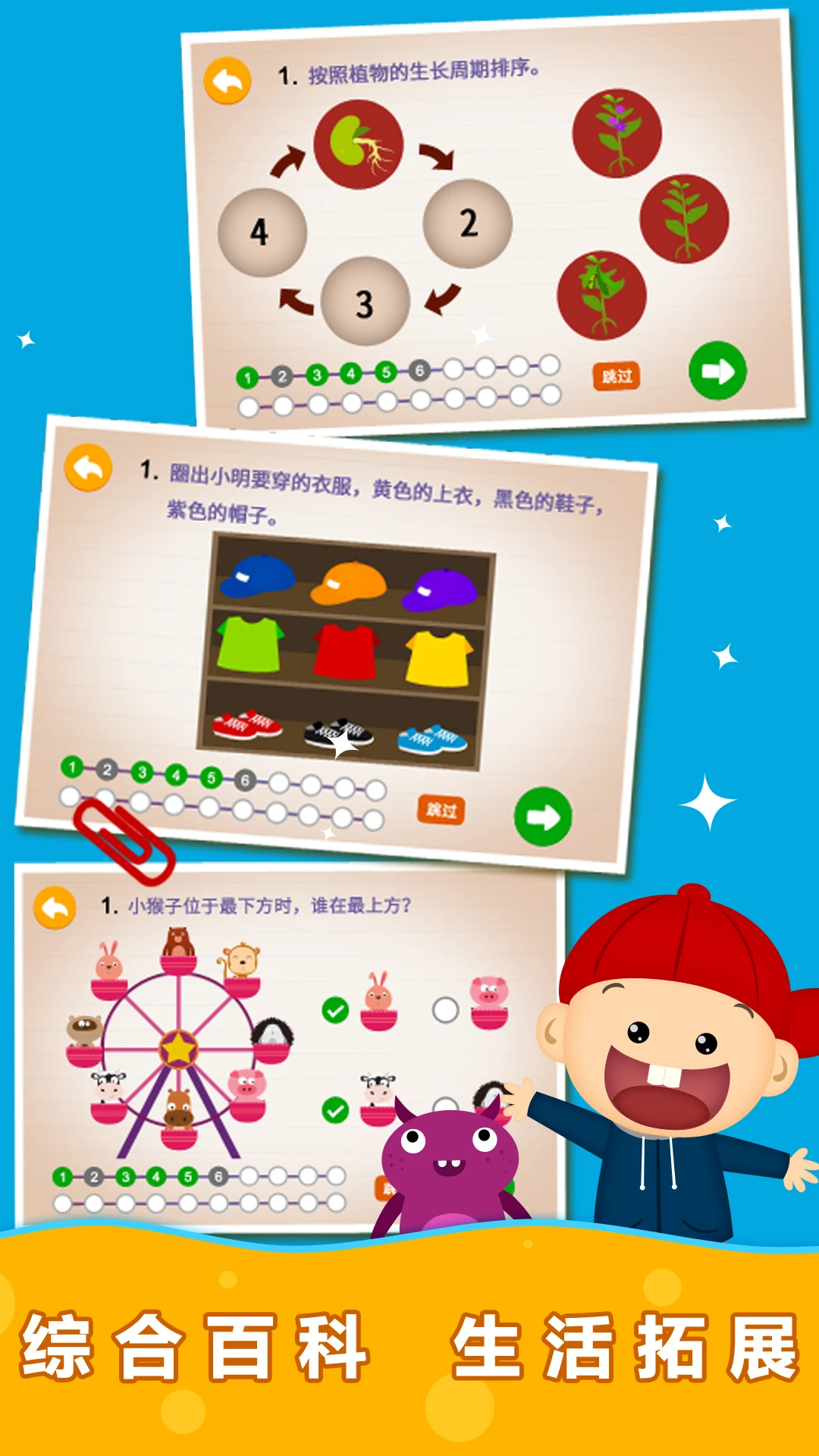 - 通过百科常识、生活习惯、思维逻辑相关的练习,培养综合能力;
