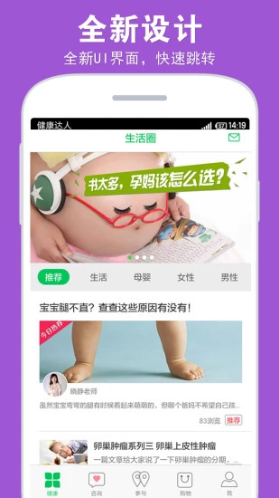 千千万关心宝贝成长的妈妈们,快来健康达人跟育儿专家们零距离沟通吧!!不管是常见育儿问题,还是幼儿培养心得,健康达人一定给你最体贴细致的在线解答、最贴心实用的心得分享、最专业权威的育儿建议,让你轻轻松松变身时尚辣妈,在每个阶段呵护宝贝及全家的健康。