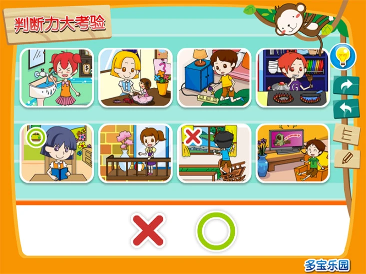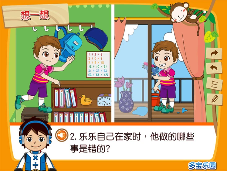 乐乐在家时,他做的哪些事是对的?哪些事是错的呢?你曾经自己在家吗?自己在家时要注意什么呢?家里哪些地方容易发生危险呢?会发生什么危险呢?一起来说说看。