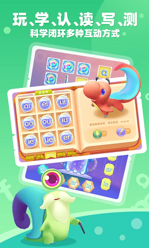 小伴龙拼音App根据2-8岁儿童认知发展规律精心设计。在趣味故事情境中,好玩的游戏互动中,帮助孩子快乐学拼音,克服拼音启蒙过程中发音难、拼读难、记音形难的问题!快和3D形象小伴龙一起,进入拼音小镇,开启拼音学习之路,63个精心设计的拼音星人等着你认识。