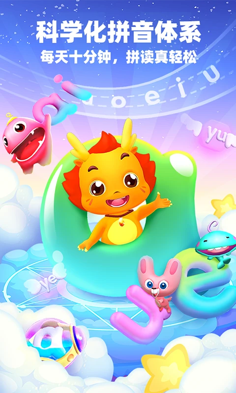 将拼音知识点融入到互动动画片故事当中,用孩子喜欢的方式学拼音。在小伴龙的陪伴下,孩子来到了一个奇妙的拼音世界,绞尽脑汁完成任务,充当牙齿护理员、森林护林员、维修四声调喷泉,认识了一个个活泼可爱的拼音伙伴,终于集齐了拼音图鉴中的拼音球,帮助咕噜星人重新识字!孩子也自然学会了拼音。