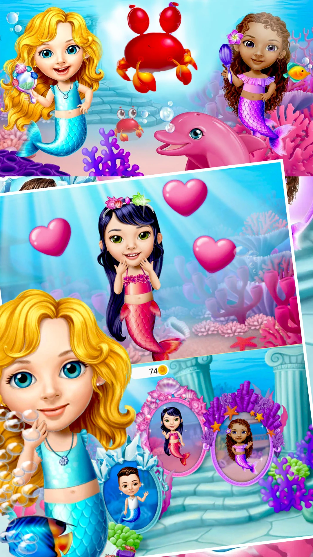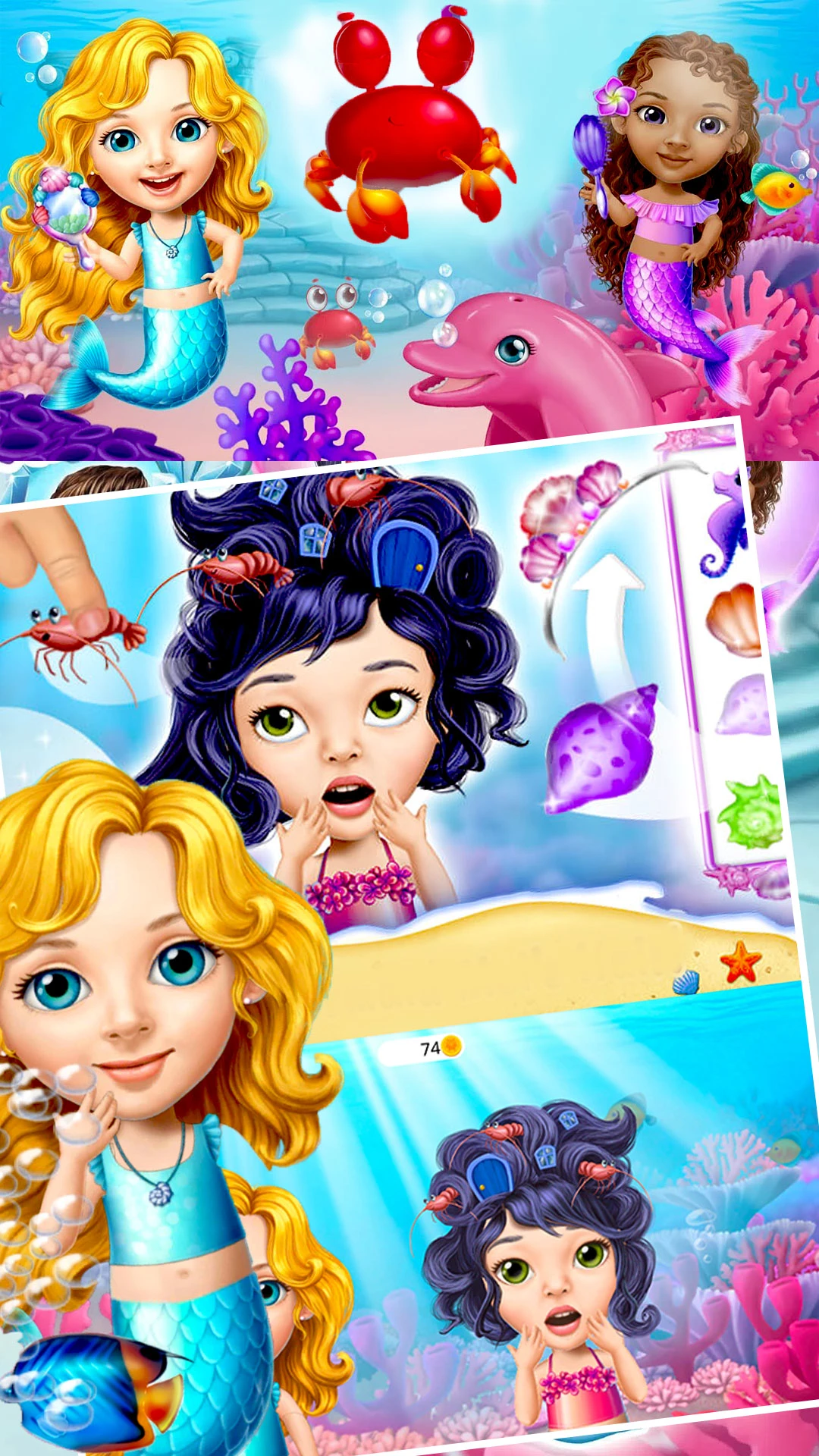 潜入神奇的海底世界,了解可爱和友好的美人鱼的秘密生活!探索海洋,并与可爱的海豚,外来鱼类,螃蟹和其他海洋生物一起玩有趣的美人鱼化妆!