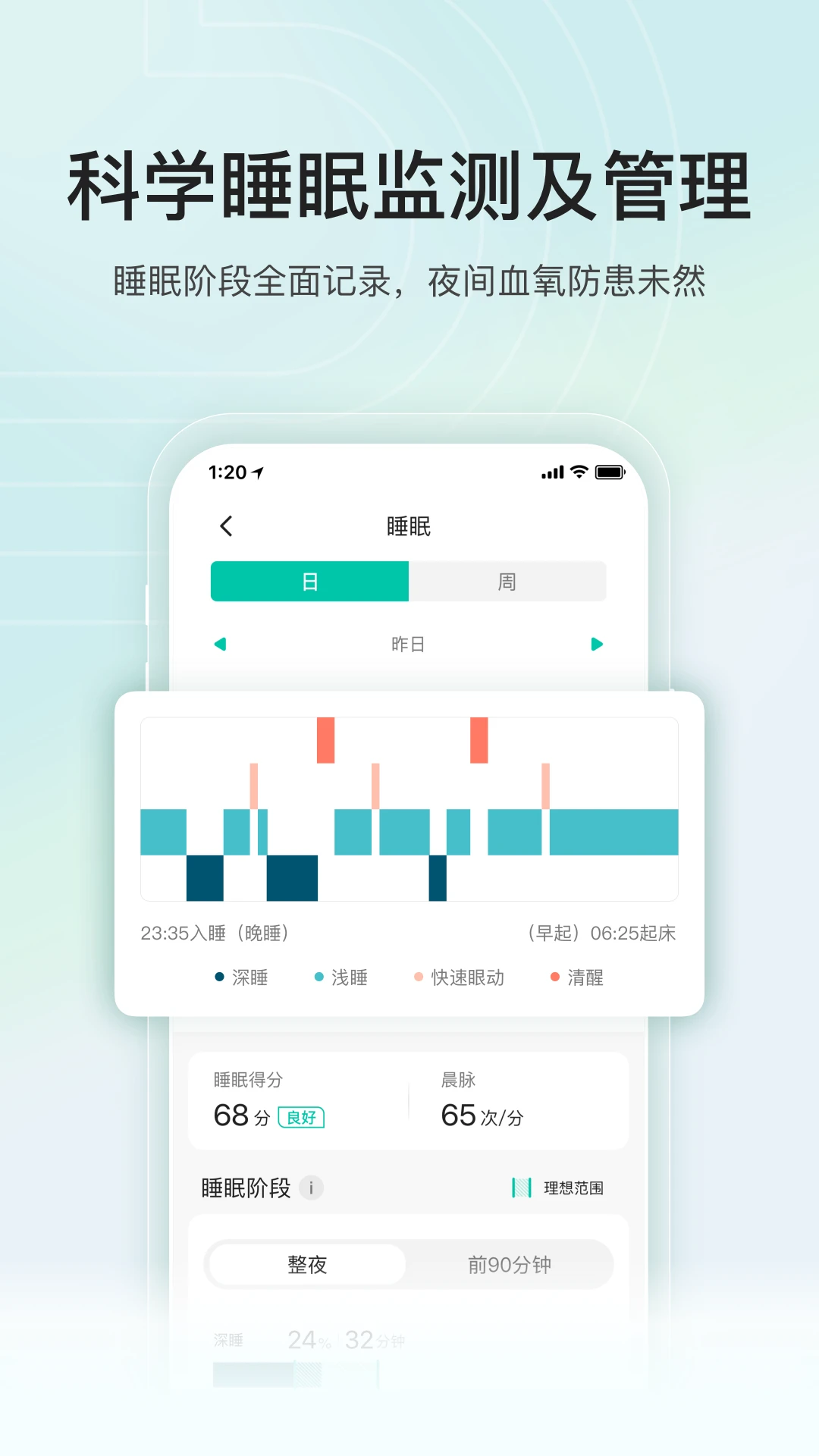睡眠阶段全面记录(浅睡、深睡、快速眼动和清醒),提供科学的睡眠质量评估、睡眠规律,以及睡眠中疑似过高心率风险和疑似过低血氧风险提示,帮助您防患于未然。
