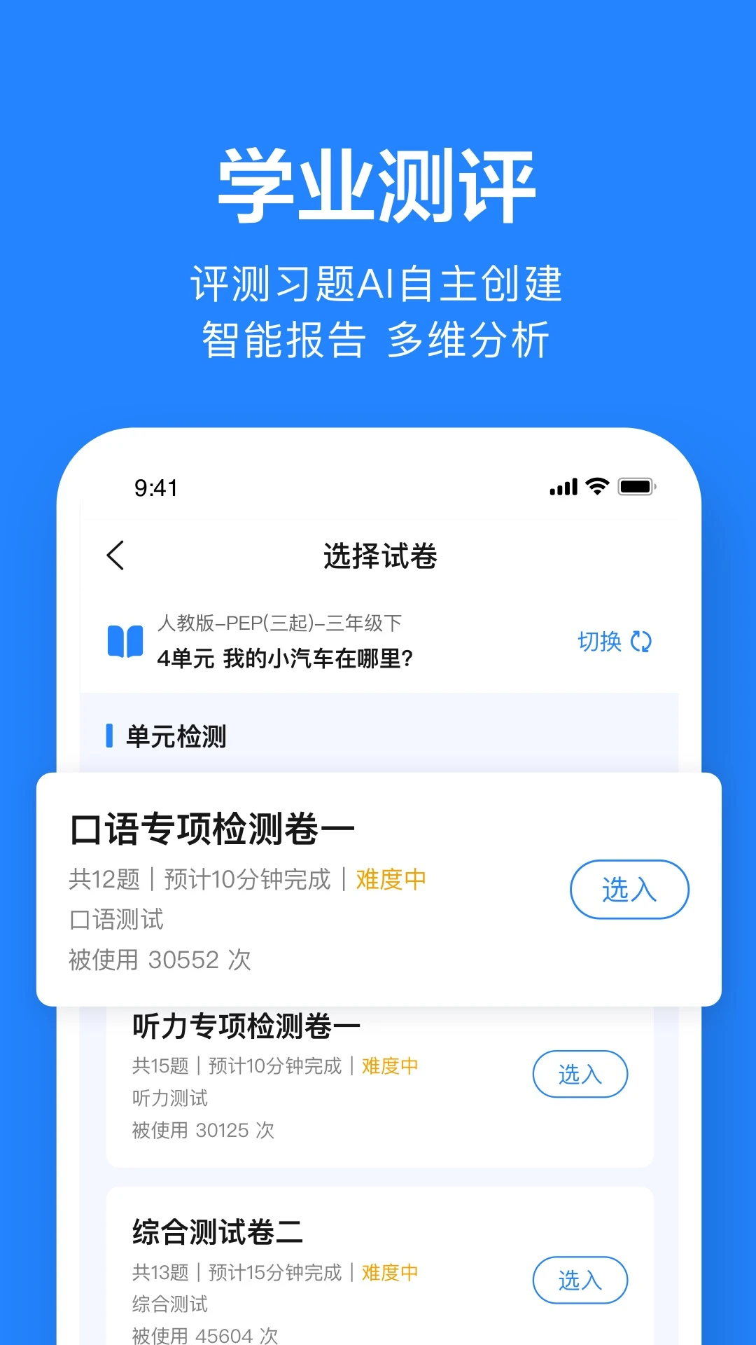 推荐练习:随时随地推荐练习,灵活选择随堂训练、同步习题、绘本、口语、配音、试卷,形式丰富,满足教学需求;