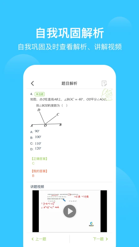 【课后练习 线上提交】学生可以在线提交课后练习,并可自行进行答案的对照、对于不会的题目还可自行查看解析、查看讲题视频,让学生可以在家就能实现哪里不会学哪里,再也不怕遇到妈妈也不会的题了。