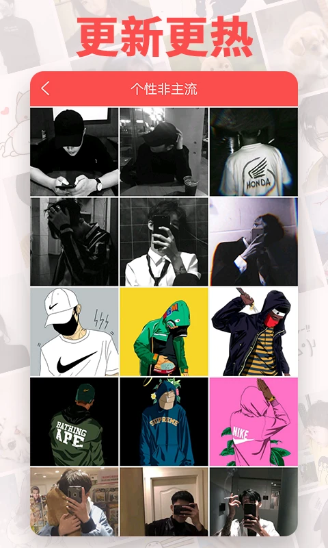 3、提供十多个分类,分类清晰明确,快速定位自己的爱好。让你的头像与众不同,个性十足。