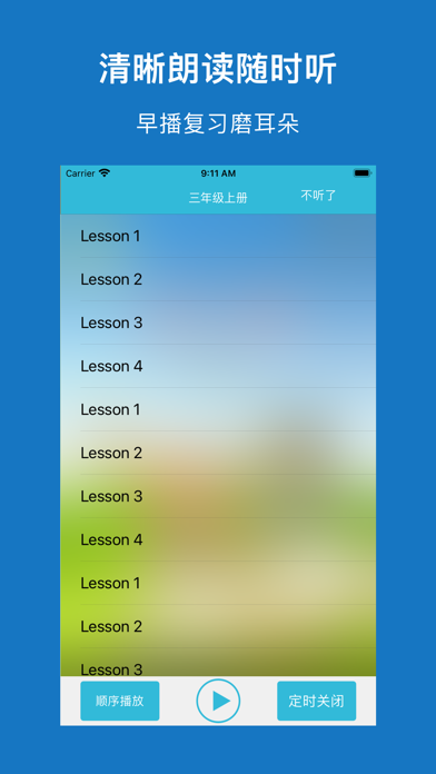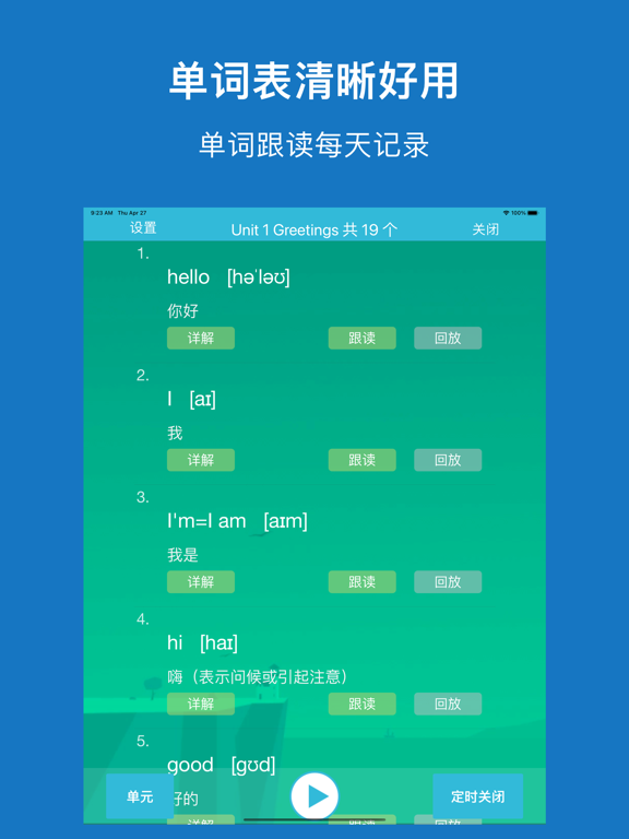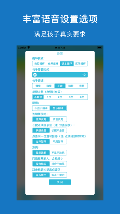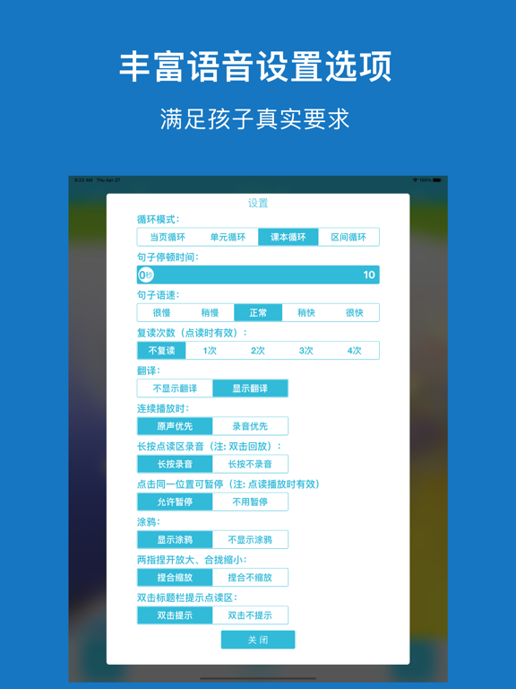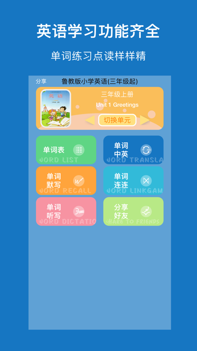 * 适用鲁教版小学英语课本(三年级起点)高清版教材中小学生使用,共8册配套点读教材; * 高音质、高清晰、纯正标准,随时陪伴孩子读出来,易学易用很轻松; * 句子可翻译、语速可调,各种情况全满足; * 逐句录音,整页播放,制作自己的点读书本; * 学习进度,随时看,自动打分送鼓励; * 点读变听书,播放方式随意调 * 无广告。 【点读功能】 长按播放按钮,就能看到多个实用的跟读设置: 1、跟读模式:循环当页、循环单元、循环课本、区间循环 2、句子语速:正常、稍慢、很慢 3、翻译开关 4、句子停顿时间 5、优先顺序:录音优先、原音优先 6、涂鸦:随书页显示涂鸦、不随书页显示涂鸦 7、手机屏幕太小?支持捏合放大缩小! 【录音功能】 长按句子,提示录音: 1、双击句子,播放录音 【涂鸦功能】 点击画笔按钮,进入涂鸦状态: 1、色板:调整颜色、选择橡皮擦 2、清空:重新开始 3、截图:把手写效果保存本地,或者分享给其它人 【听书功能】 一下按钮,立马点读变听书,简单易用两设置: 1、播放方式:顺序播放、单曲循环、列表循环 2、定时关闭:自动停止朗读的时间,你来设定 【单词功能】 各种单词训练,玩转单词不烦恼: 1、单词听写 2、单词连连看 3、单词中英文互译 4、单词默写 希望【鲁教小英】APP的实用功能,可以帮您减轻陪孩子读书的烦恼。