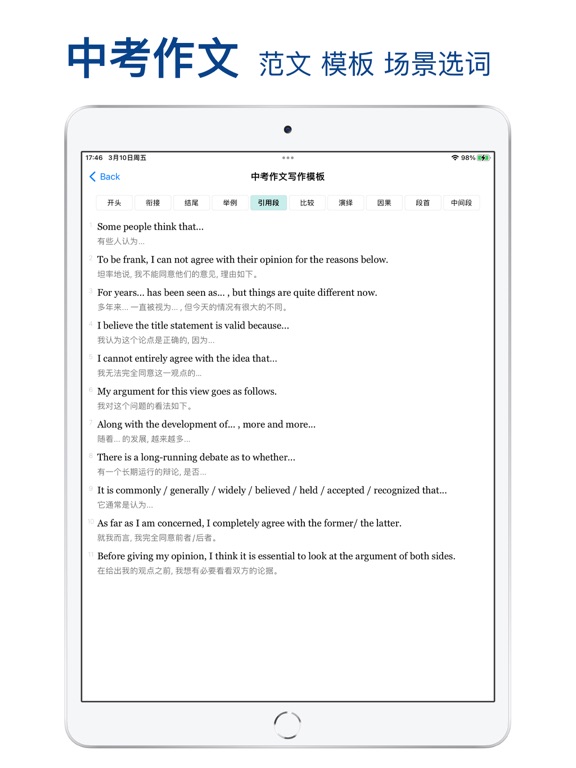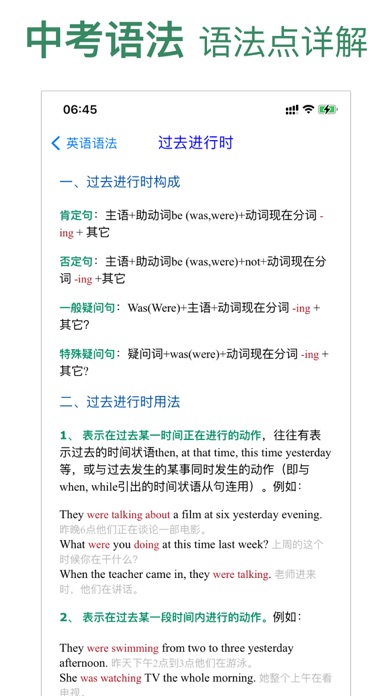 - 串通中考英语考点 - 对必会知识点的总结,是复习相应内容的精华所在。建立知识体系,理清知识脉络,使学习更有系统性,复习更有针对性。 - 突破中考英语词汇 - 全面覆盖课本、大纲、必要的扩展词汇以及在中考阅读理解和完形填空中中经常碰到的高频词汇, 以艾宾浩斯记忆曲线作为记忆理论指导, 结合听背方式, 用全局视野,实现高效单词记忆, 实现6次以上的重现率,结合软件中的词汇学习,测试及生词本工具,多种方式增强记忆效果,立体记忆. - 突破中考英语语法 - 提炼初中英语大纲对语法的要求, 通过简洁的描述,帮助英语初学者迅速掌握语法考点. - 突破中考英语语音听力 - 提供英语字母和音标的标准音,并配备精选的例词,整理英语发音规则,帮助打牢交际英语基础. - 突破中考完形与阅读 - 从实战角度全面阐述中考完形填空和阅读理解的答题技巧和易失分点,助力中考英语高分 - 突破中考英语作文 - 从选词造句到句型训练,从标准作文模板到优秀范文,全面指导训练中考高分作文能力本次更新: 1. 增加完形填空与阅读理解解题指导,帮助中考拿分 2. 进一步优化初中英语语法知识点的讲解 3. 优化界面UI交互 4. 修复反馈的问题 最近更新: 1. 优化词汇数据 2. 增加听背单词功能 3. 增加中考阅读理解高频词汇 4. 增加中考完形填空高频词汇 5. 增加作文写作辅导功能 6. 拼读规则功能增强