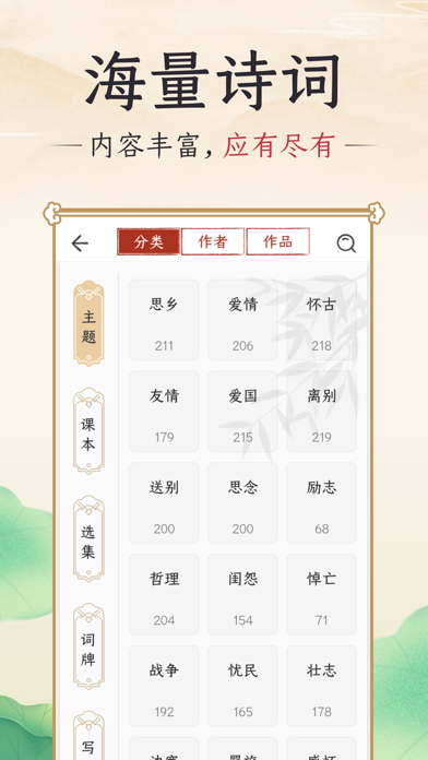 千古诵诗词是一款专业的古诗词学习赏析应用,内有唐诗、宋词、文言文、古籍、诗友圈、诗词朗诵、飞花令等诗词学习工具,不仅能够帮助广大学者和诗词爱好者秒懂古诗词之含义,掌握诗词学习之要领,还能从多方面解析古诗词所蕴含的深意,理解诗人创作时的心境,达到理解记忆目的的同时,更能深刻感受古诗词传统文化博大精深的魅力! 主要功能: 【诗词文库】百万诗词文库,按朝代、作者、作品等分类,包含注释、译文及赏析,发现中华五千年文明。 【诗词分类】精选分类包括:主题、选集、词牌、写景、名山、节气、时令、时间、节日、花卉、地理、城市、用典、课本等。 【诗词搜索】按朝代搜索:先秦、两汉、三国、晋代、南北朝、隋、唐、五代、宋、辽、金、元、明、清等。按作者搜索:李白、杜甫、李清照、王维、白居易、辛弃疾、孟浩然、杜牧、苏轼、屈原、李商隐、陆游、李煜、陶渊明、柳永、温庭筠等。 【诗词选集】唐诗三百首、古诗三百首、文言文翻译、宋词三百首、元曲三百首、诗经、乐府、论语、红楼梦、三国演义、水浒传、西游记等。 【高效学习】可生成专属学习计划,学而有术,掌握高效的学习方法,图文并茂有声朗读的学习诗词和复习诗词 【诗词游戏】诗词飞花令和诗词接龙等诗词游戏,让想学习富有趣味性和竞技性。 【跟读背诵】名家朗诵,加深诗词理解和记忆。 【名句赏析】经典名句,感受古人用词之精辟。 【国风主题】诗情画意,领略古诗文意境之美。 【详尽解析】逐字逐句,注释翻译通俗且易懂。 隐私政策: http://gushi.zld666.cn/privacyPolicy?package_name=com.zld.gushici.qgs&platform=ios&channel=AppStore 用户协议: http://gushi.zld666.cn/userAgreement?package_name=com.zld.gushici.qgs&platform=ios&channel=AppStore 会员服务协议:http://gushi.zld666.cn/vipServiceProtocol?package_name=com.zld.gushici.qgs&platform=ios&channel=AppStore修复bug,优化用户体验。