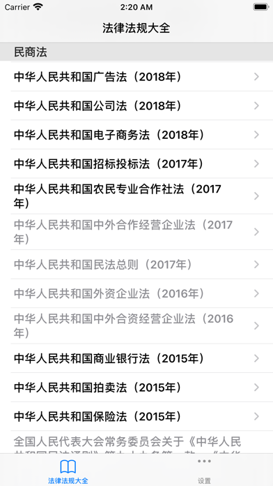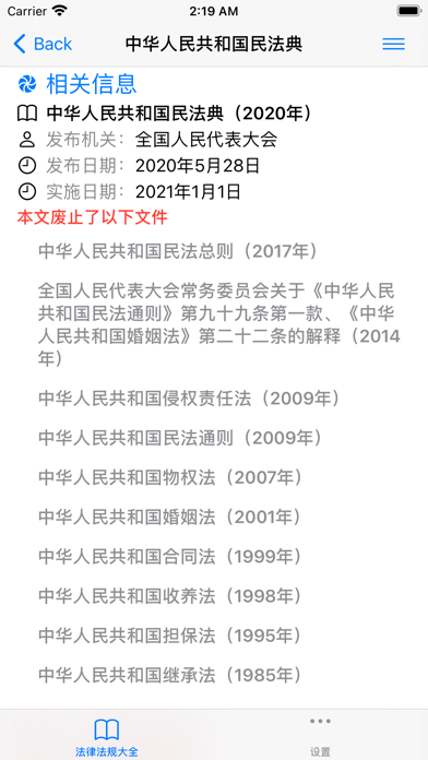 收录了总计1万多部中国建国以来的法律文件、国务院颁布的行政法规、最高人民法院公布的司法解释,公安部、司法部、最高人民法院、最高人民检察院颁布的部门规章。内容包含法律文件的全文、当前生效状态和历史变更文件,可以准确的显示修正案和法律正文的关系。 免费用户无需注册即可免费查阅人大法律全文和国务院行政法规;订阅会员可以查阅司法解释和部门规章,使用全文搜索和快速转跳功能。 法律法规大全的基本分类有:宪法、民商法、刑法、环境保护法、社会法、程序法、经济法、行政法、行政法规、司法解释、法院文件、公安部令。 适合律师,法律学者,法律专业学生,公务员考试,司法考试等法律专业人士,是婚姻、民事、刑事等法律问题的权威解释,是法律行业的专业工具! 法律文件更新进度 法律全文(免费查阅):更新至主席令第二十八号,2024年6月28日。 行政法规(免费查阅):更新至国令第788号,2024年8月5日。 司法解释(订阅会员):更新至法释〔2024〕9号,2024年8月21日。 法院文件(订阅会员):更新至2024年6月26日。 检察院文件(订阅会员):更新至2024年7月25日。 公安部令(订阅会员):更新至公安部令第169号,2024年4月15日。 司法部令(订阅会员):更新至司规〔2024〕1号,2024年4月3日。 国家卫生健康委员会令(订阅会员):更新至国家卫生健康委员会令第12号,2023年11月13日。 住建部令(订阅会员):更新至建市规〔2023〕3号,2023年9月6日。 其他部门规章⋯⋯ 用户协议: https://flfgsc.cn/help/terms-of-use 隐私政策: https://flfgsc.cn/help/privacy-policy修复了一个本地数据访问错误的问题